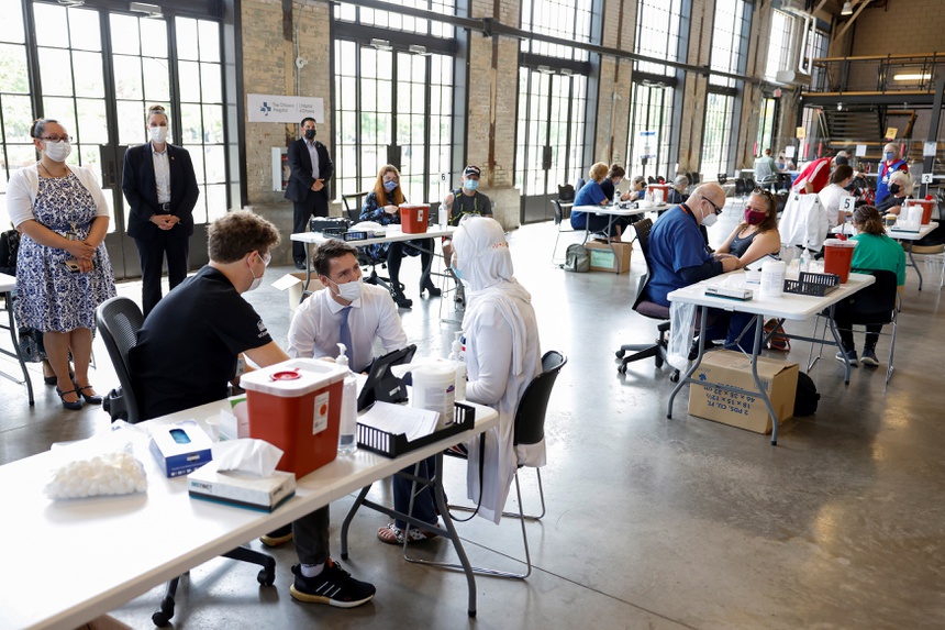 Thủ tướng Justin Trudeau thăm một điểm tiêm vaccine ở Ottawa, Ontario, đầu tháng 7. Nhờ nỗ lực tiêm chủng, Canada vào tháng này tuyên bố mở cửa lại biên giới, trước hết là với người Mỹ đă được chủng ngừa đầy đủ. Ảnh: Reuters.