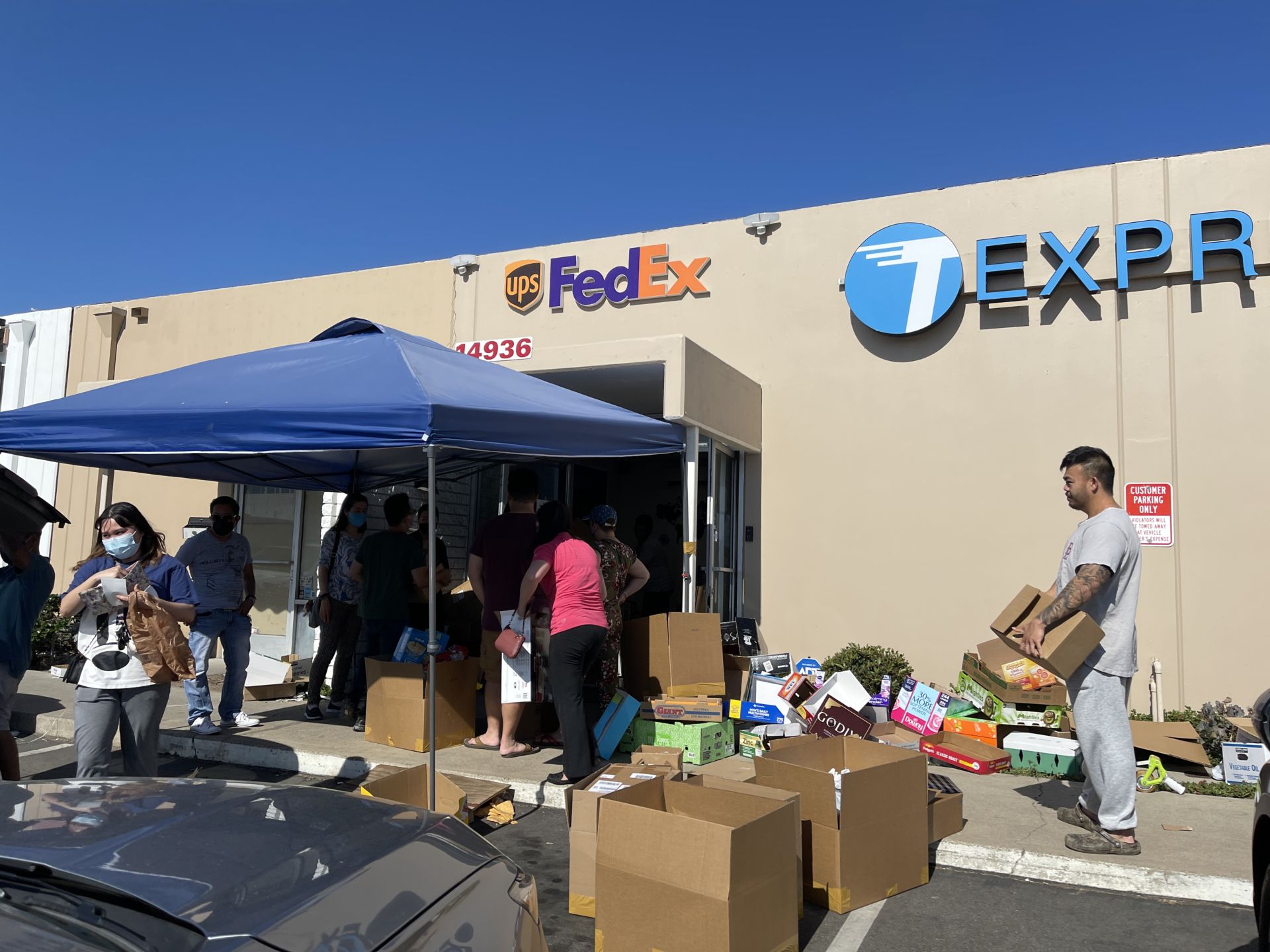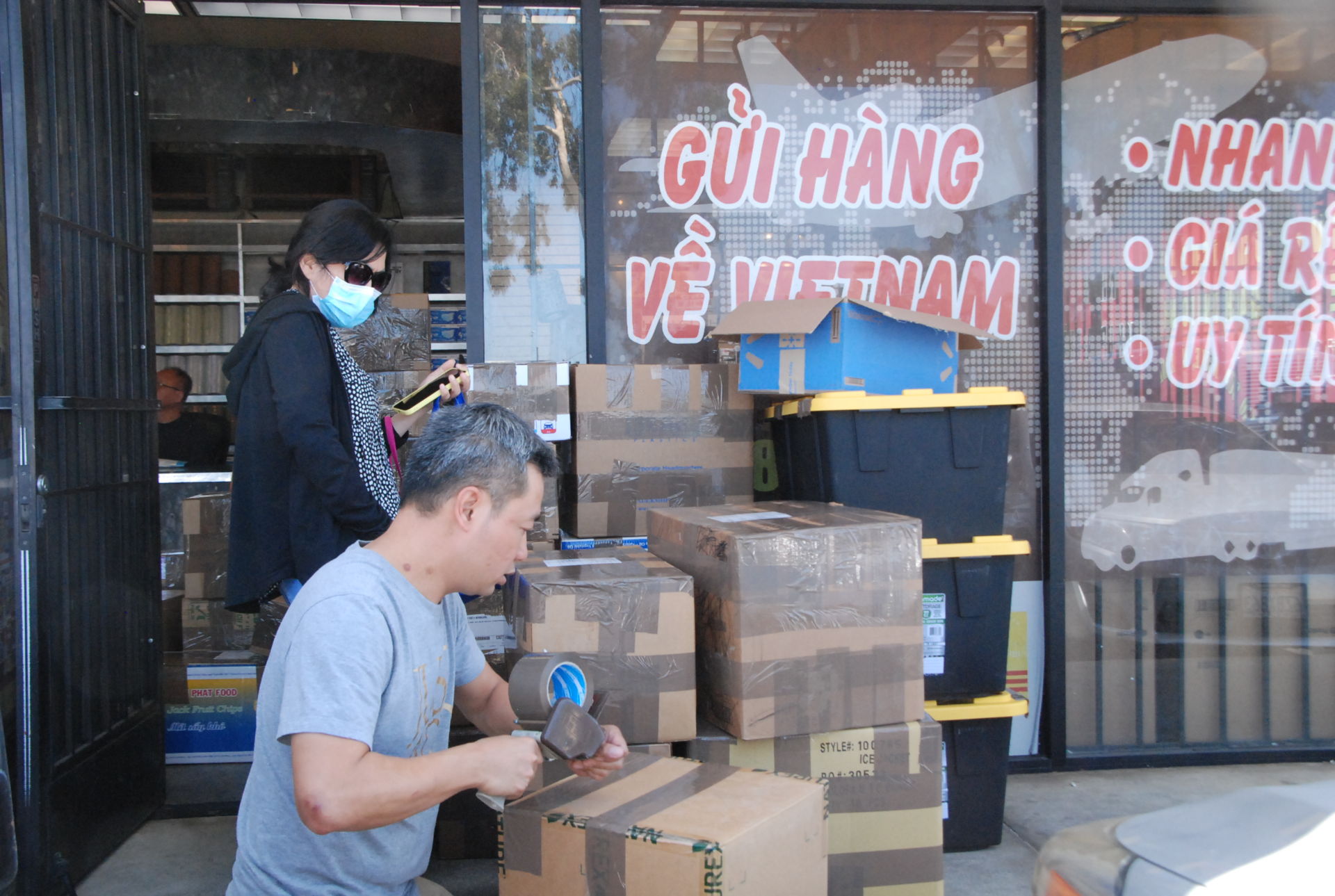 Trưa 19 Tháng Bảy, bất chấp trời nắng gay gắt hơn 80 độ F, chị Thảo Triệu, ở Anaheim lái xe tới tiệm Phúc Lộc Pakmail, đối diện thương xá Phước Lộc Thọ, để gửi hàng về cho gia đ́nh ở quận 8, Sài G̣n.
