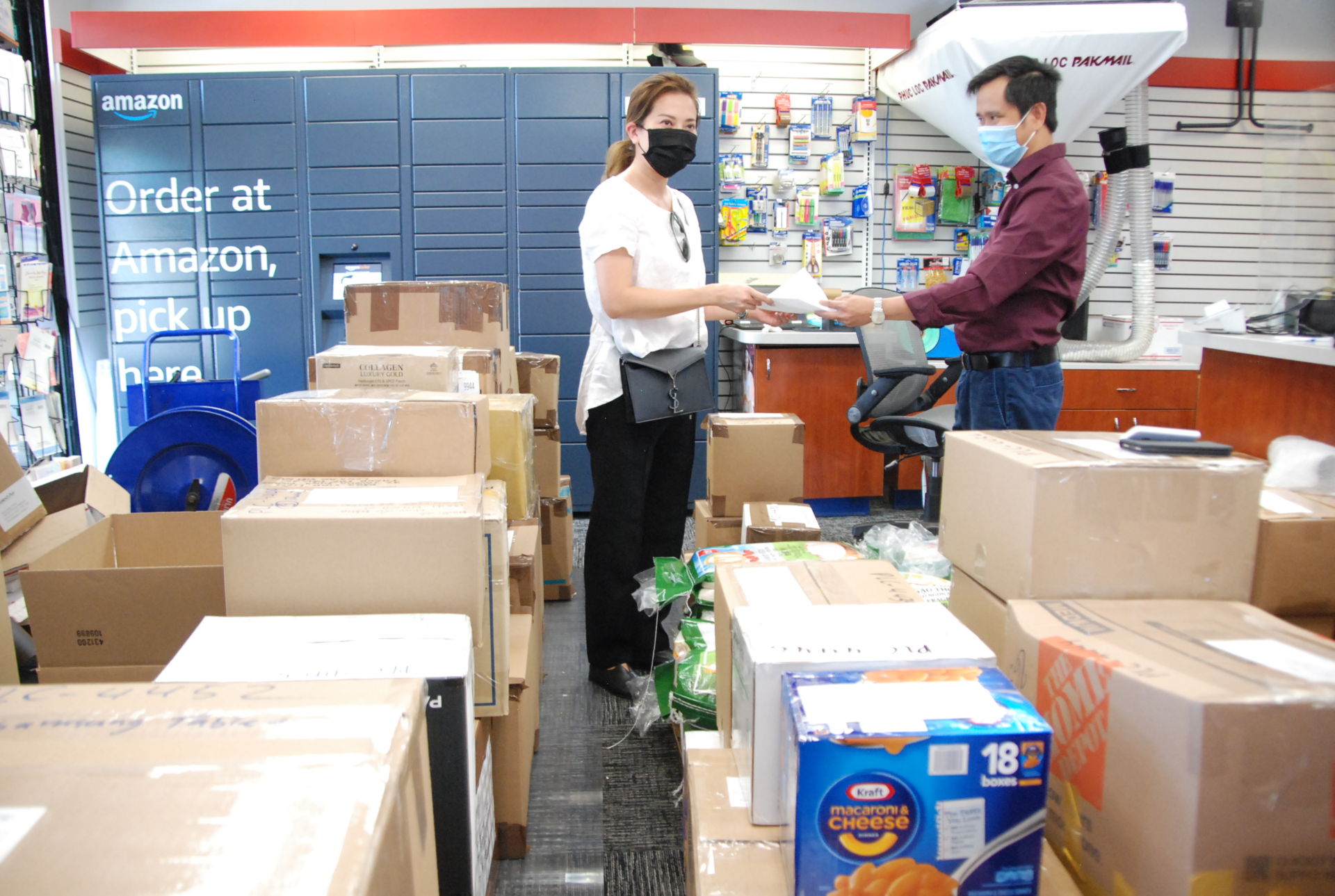 Chị Hồng Diệp (trái) gửi hàng ở Phúc Lộc Pakmail. ((H́nh: Đoan Trang/Người Việt)