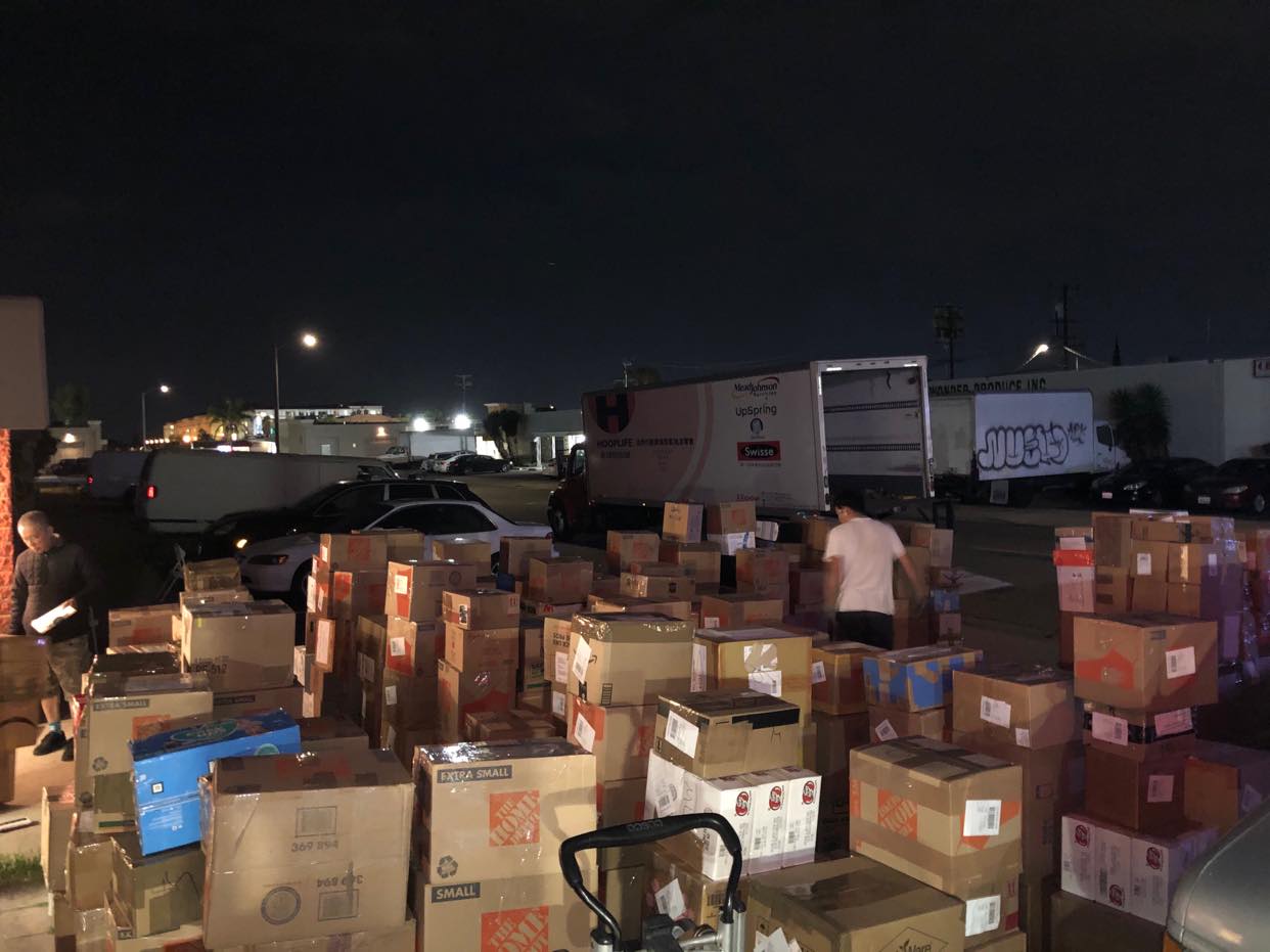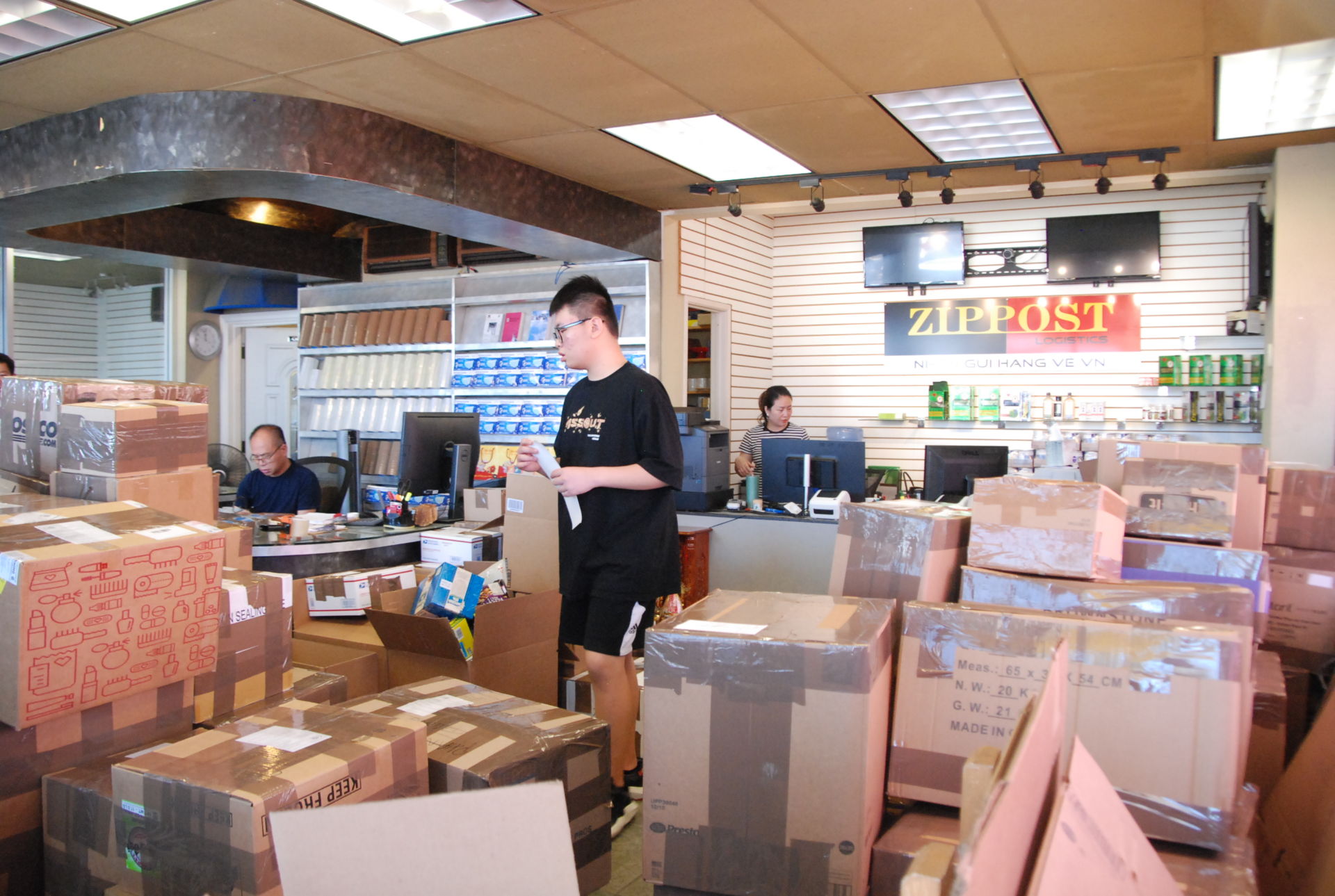 Tràn ngập hàng hóa gửi về Việt Nam tại Zippost Logistics trên đường Bolsa, Westminster. (H́nh: Đoan Trang/Người Việt)