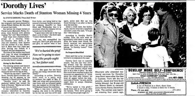 Một tuần sau khi Dorothy Scott mất tích, bà Vera, mẹ của cô, nhận được một cuộc điện thoại lạ. Người gọi hỏi liệu Vera có phải người thân của Dorothy không. Khi Vera trả lời "có", anh ta nói "Tôi đă t́m được cô ấy", rồi cúp máy. Sau đó, vào tháng 6 năm 1980, tờ Santa Ana Register, một tờ báo của Quận Cam, đăng tải câu chuyện về sự mất tích của Dorothy Scott. Cùng ngày hôm đó, biên tập viên tờ báo, Pat Riley, nhận được một cuộc điện thoại nặc danh. Người gọi nói với Pat rằng "Dorothy là t́nh yêu của tôi. Tôi bắt quả tang cô ấy ngoại t́nh với người đàn ông khác. Cô ấy phủ nhận việc có người thứ ba. Chính v́ thế tôi đă giết cô ấy".