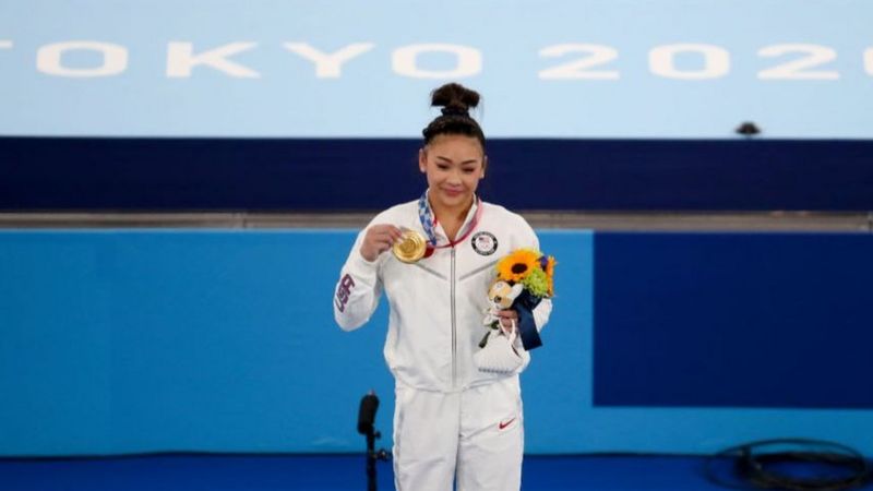 Sunisa Lee của Hoa Kỳ trong lễ trao huy chương trong trận chung kết toàn năng nữ thể dục nghệ thuật tạ Thế vận hội Olympic Tokyo 2020