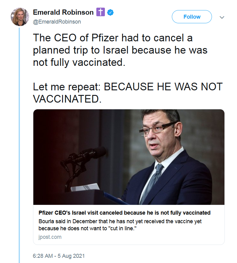 Despite that photo, Emerald Robinson, a reporter for the conservative outlet Newsmax who has a history of spreading dubious claims, tweeted to her 400,000 followers on Aug. 5: “The CEO of Pfizer had to cancel a planned trip to Israel because he was not fully vaccinated. Let me repeat: BECAUSE HE WAS NOT VACCINATED.”