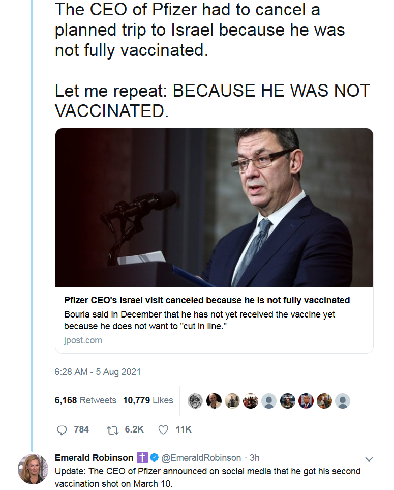 The CEO of Pfizer posted a photo of himself getting the second shot of the COVID-19 vaccine on March 10. But an Aug. 5 tweet from Newsmax reporter Emerald Robinson misleadingly suggested he isn’t vaccinated. She updated the tweet hours later, acknowledging the CEO’s post — but after her claim had spread, uncorrected, on other social media.