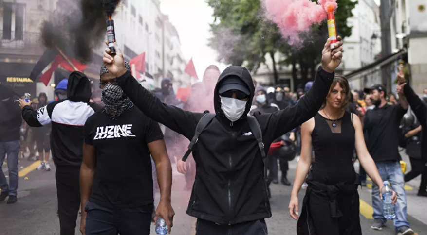 Trong các cuộc biểu tình có những người "áo gi lê vàng", cờ Pháp bay phấp phới và thậm chí xuất hiện một số biểu tượng của những người cực đoan cánh tả.