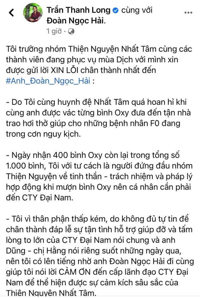 “Tôi trưởng nhóm Thiện Nguyện Nhất Tâm cùng các thành viên đang phục vụ mùa Dịch với ḿnh xin được gửi lời XIN LỖI chân thành nhất đến anh Đoàn Ngọc Hải.