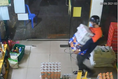 Sau đó, thanh niên này về nhà cất xe máy và đi bộ ra lại cửa hàng, đột nhập vào trong lấy đi một xe máy, một máy tính, bảy thùng bia và một túi nước xả vải.