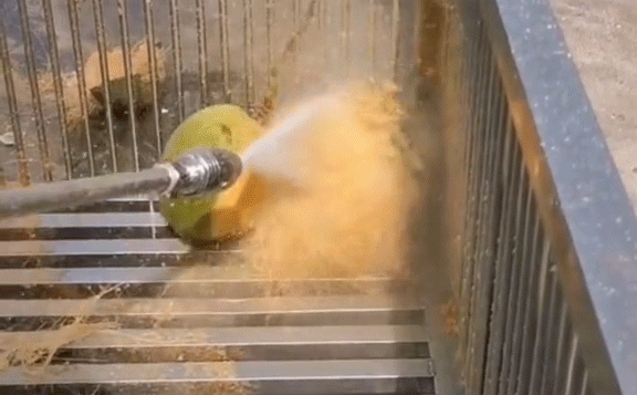 Điều đáng chú ý nhất chính là "sức công phá" của công cụ này, khi chỉ là vòi nước xịt thôi nhưng cũng có thể "thổi bay" vỏ dừa chỉ trong vài giây.