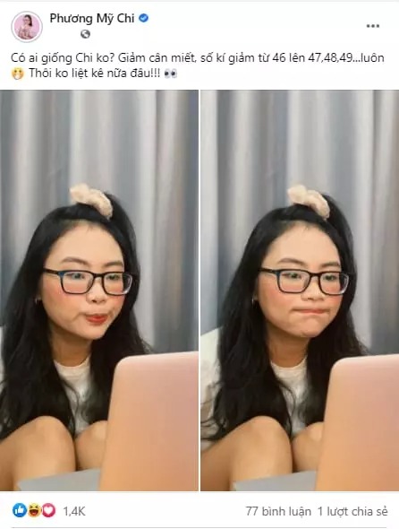 Mới đây, Phương Mỹ Chi khoe loạt ảnh mới kèm dòng caption than thở: "Có ai giống chi không? Giảm cân miết, số kí giảm từ 46 lên 48,49... luôn. Thôi không liệt kê nữa!"