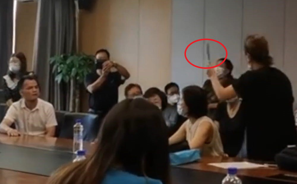Clip cho thấy, một người phụ nữ cầm dao ngay giữa cuộc họp của các nhà đầu tư với nhân viên của Evergrande và dọa tự sát ngay trong pḥng họp. Từ đoạn video có thể nh́n thấy khoảng 50 người khác cùng trong pḥng họp.