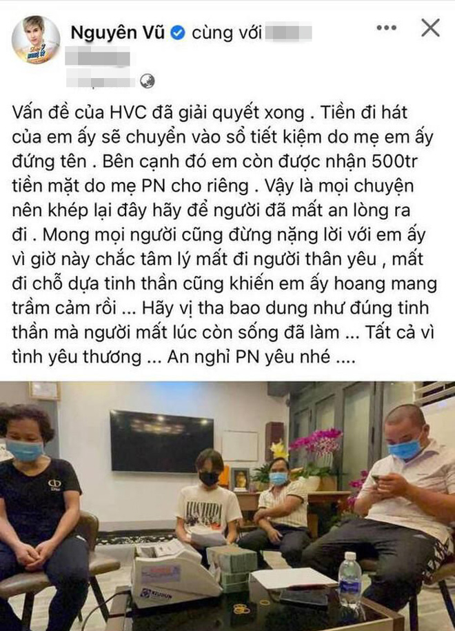 Nam ca sĩ Nguyên Vũ là một trong những người bạn thân thiết với cố ca sĩ Phi Nhung mong khán giả không nặng lời với Hồ Văn Cường. Theo anh mọi việc đã được giải quyết xong, anh mong sự việc có thể khép lại để Phi Nhung yên tâm nhắm mắt. “Vấn đề của Hồ Văn Cường đã giải quyết xong. Tiền đi hát của em ấy sẽ chuyển vào sổ tiết kiệm do mẹ em ấy đứng tên. Bên cạnh đó em còn được nhận 500 triệu tiền mặt do mẹ Phi Nhung cho riêng. Vậy là mọi chuyện nên khép lại tại đây hãy để người đã mất an lòng ra đi. Mong mọi người cũng đừng nặng lời với em ấy vì giờ này chắc tâm lý mất đi người thân yêu, mất đi chỗ dựa tinh thần cũng khiến em ấy hoang mang trầm cảm rồi... Hãy vị tha bao dung như đúng tinh thần mà người mất lúc còn sống đã làm... Tất cả vì tình yêu thương... An nghỉ Phi Nhung yêu nhé ....”.