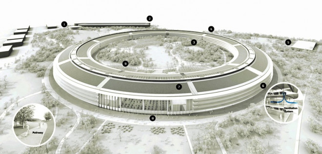Ṭa nhà chính của Apple được đặt tên “The Ring” được thiết kế có h́nh dạng vành khuyên được bao bọc bởi những tấm kính cong khổng lồ. Chu vi ṭa The Ring lên đến 1,6 km, gồm 4 tầng, 9 lối vào và 2 cửa kính lớn cao 16m. Jony Ive - Cựu giám đốc thiết kế của Apple cho biết, The Ring thực chất không nằm trên mặt đất mà nó được đặt trên 700 mâm thép không gỉ khổng lồ, có khả năng dao động đồng đều nhằm bảo vệ nền móng công tŕnh khỏi các thảm họa tự nhiên như động đất.