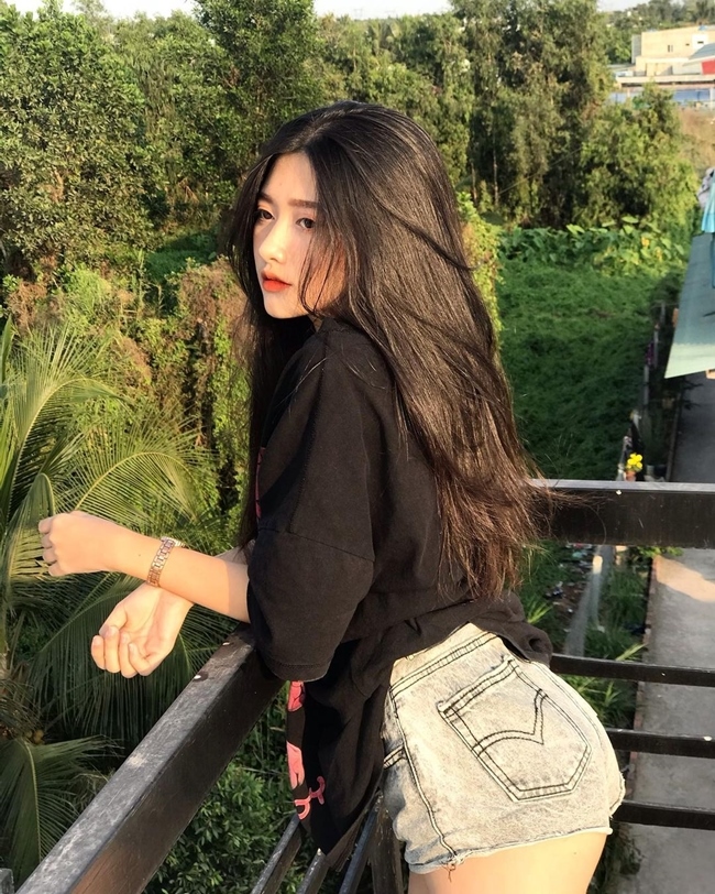 Hot girl khoa Luật Nguyễn Thúy Quỳnh lựa chọn chiếc quần short có dáng khá dài.