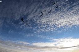 Bất ngờ, chiếc máy bay lảo đảo, rồi lượn cắt ngang qua nhóm người nhảy dù đang rơi xuống nhưng rất may là không có va chạm xảy ra.