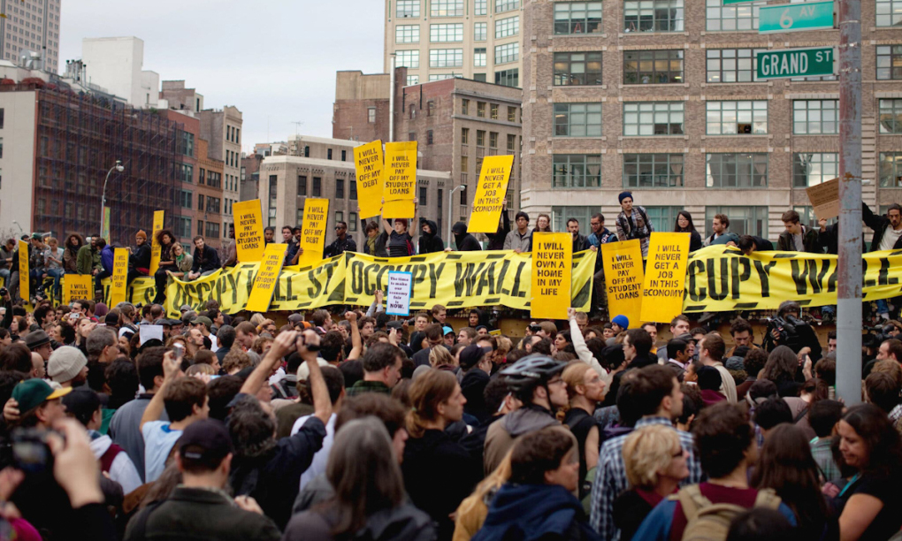 Năm 2011, người biểu t́nh t́m cách chiếm Phố Wall, khu tài chính nổi tiếng ở thành phố New York, cũng như công viên Zuccotti gần đó để tỏ rơ sự phẫn nộ với 1% người giàu nhất nước Mỹ.