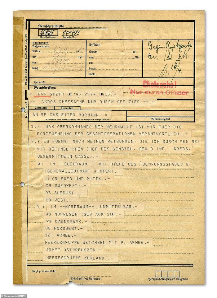 Các nhà sử học tìm được một số tài liệu mật được gửi từ boongke bí mật của trùm phát xít Hitler tại Berlin, Đức. Nhờ vậy, mệnh lệnh cuối cùng của y được làm rõ.