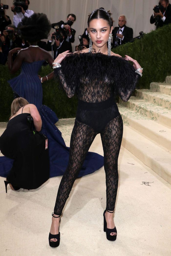 Dù trước hay sau 18 tuổi, Olivia Rodrigo vẫn dành sự yêu thích cho những thiết kế tông đen. Đôi khi, cô làm mới mình bằng những màu sắc nổi bật hơn như đỏ, neon. Tuy nhiên, trước 18 tuổi, nữ ca sĩ chưa bao giờ khoe da thịt quá đà trên thảm đỏ. Những bộ váy ren, họa tiết khiến cô trông già dặn hơn tuổi. Bù lại, kiểu trang điểm tự nhiên giúp cô luôn tỏa sáng. Vào tháng 1, khi chưa tới sinh nhật, người hâm mộ còn phát hiện cô cô mang giày Converse giản dị phối cùng áo da đen. Ảnh: G, Vogue.