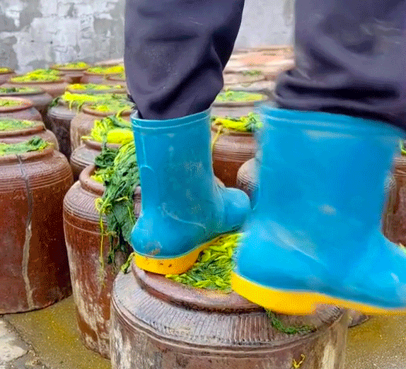 Thay vì dùng tay, đeo găng tay cho vệ sinh thì người trong video lại đi ủng và... nhảy thẳng lên trên từng vại dưa, dùng lực của chân để nhấn xuống. Cách làm này có vẻ hiệu quả hơn và đỡ mệt hơn so với bằng tay thì phải? Ấy thế nhưng, nó lại khiến cho những người xem video tá hoả bởi cảm giác về độ vệ sinh của món ăn này gần như là... không còn nữa.