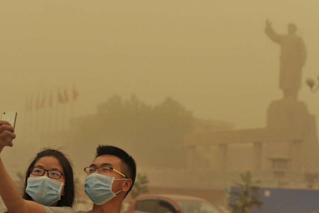 Hai người chụp ảnh trong cơn băo cát ở Kashgar, Tân Cương, Trung Quốc. Ảnh: Reuters