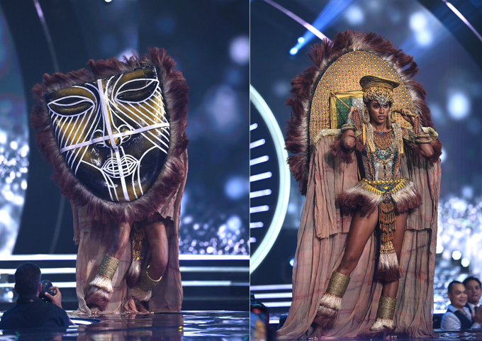 Trang phục lấy cảm hứng từ lễ hội hóa trang truyền thống nổi tiếng của bộ tộc phía đông nam Nigeria mang tên Mmanwa. Mmanwa là trang phục hóa trang nữ dành cho các nghi lễ và lễ hội để tôn vinh di sản văn hóa phong phú của Nigeria, đề cao sức mạnh của phụ nữ - người sở hữu chúng. Thiết kế được tạo nên từ các hạt đá beed của Châu Phi, cùng phụ kiện làm hoàn toàn thủ công. Điểm nhấn bộ cánh nằm ở mặt nạ bộ lạc dài một mét vẽ khuôn mặt biểu tượng Mmanwa cùng áo choàng màu sắc đồng họa tiết.