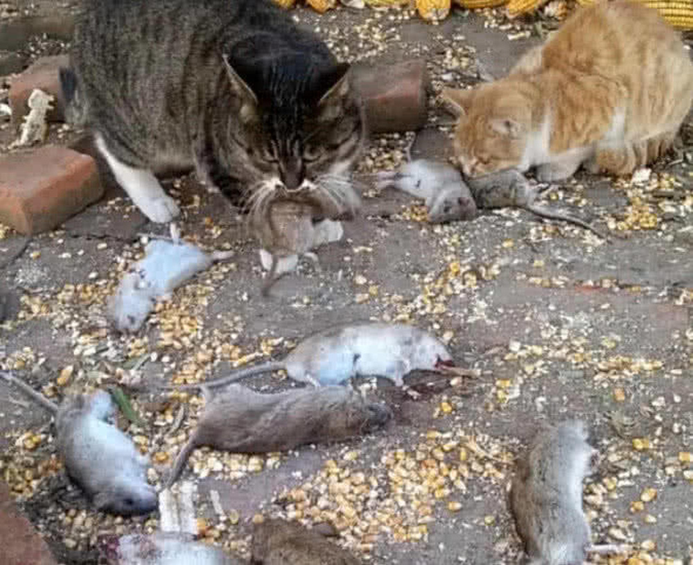 Thì ra chỉ sau 2 tiếng về ở nhà mới, 2 con "mèo lười" của cô đã lập được chiến tích lẫy lừng, bắt gọn hơn chục con chuột trong kho chứa gạo của bố mẹ.