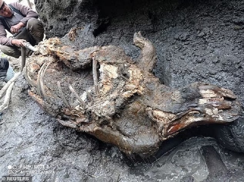 Phần còn lại của một con tê giác lông, đã tuyệt chủng khoảng 14.000 năm trước, được đào ra khỏi lớp băng vĩnh cửu vào tháng 7/2021. Ảnh: Reuters