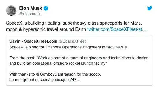 Tỷ phú Elon Musk tiết lộ trên Twitter: "SpaceX đang xây dựng một cảng vũ trụ nổi, siêu nặng phục vụ cho mục đích thám hiểm Sao Hỏa, Mặt trăng và du hành siêu thanh ṿng quanh trái đất".