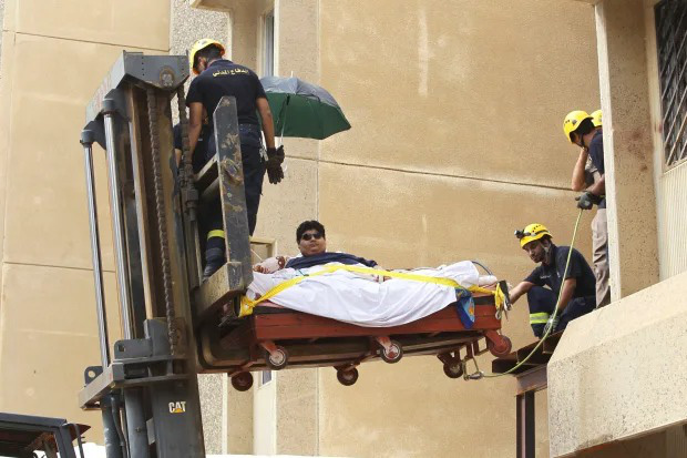 Sau khi quốc vương ra lệnh, chính quyền đã quyết định đưa cậu bé đến bệnh viện để chữa bệnh béo phì. Nhưng công việc di chuyển Khaled 610kg ra khỏi căn hộ trên tầng cao chung cư không hề dễ dàng.