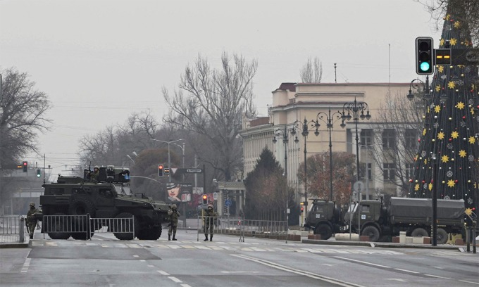 Binh sĩ Kazakhstan đứng gác tại một chốt kiểm soát trên đường phố Almaty ngày 7/1. Ảnh: Reuters.