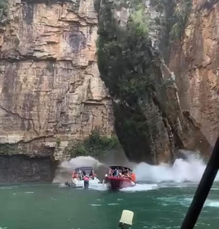 Khoảnh khắc vách đá lớn đổ nghiêng lên thuyền du lịch ở Brazil hôm 8/1. Ảnh: Mendonça.