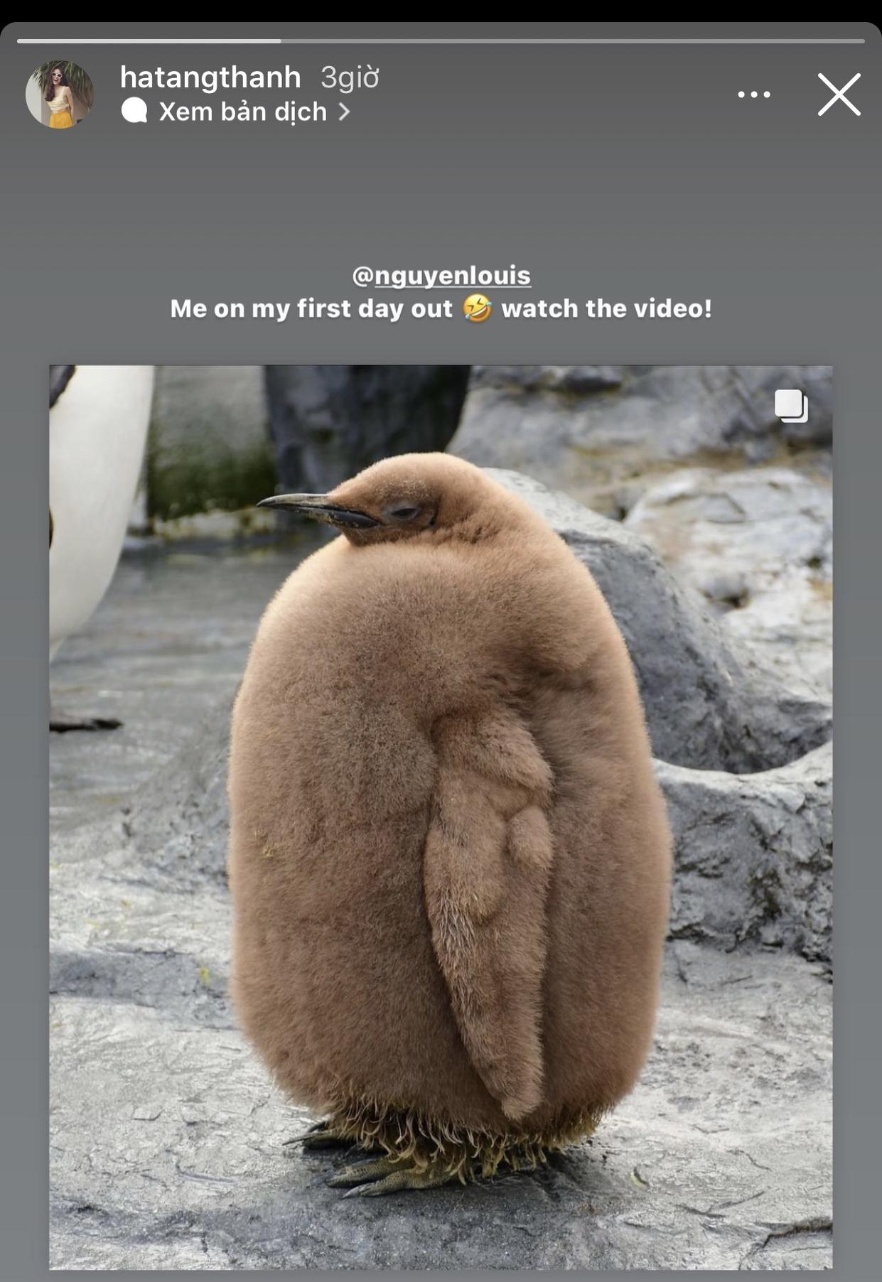 Sáng 13/1, trên Instagram cá nhân của mình, Hà Tăng đã đăng tải một story thu hút sự chú ý của người hâm mộ. Cụ thể, người đẹp chia sẻ lại hình ảnh một con chim cánh cụt trong thời tiết mùa đông ở Nam Phi. Kèm với bức hình này, Hà Tăng còn gắn thẻ ông xã Louis Nguyễn và viết dòng chú thích: "Me on my first day out" (Tạm dịch: Tôi ngày đầu tiên ra ngoài).