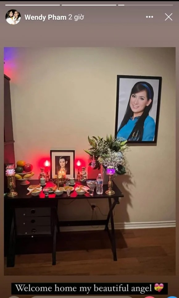 Đặc biệt, Wendy Phạm cũng không quên treo ảnh của mẹ thuở sinh thời. Cô cũng khiến khán giả rơi nước mắt vì dòng chia sẻ quá cảm động: "Welcome home my beautiful angel". (Tạm dịch: Mừng mẹ về nhà thiên thần xinh đẹp của con).