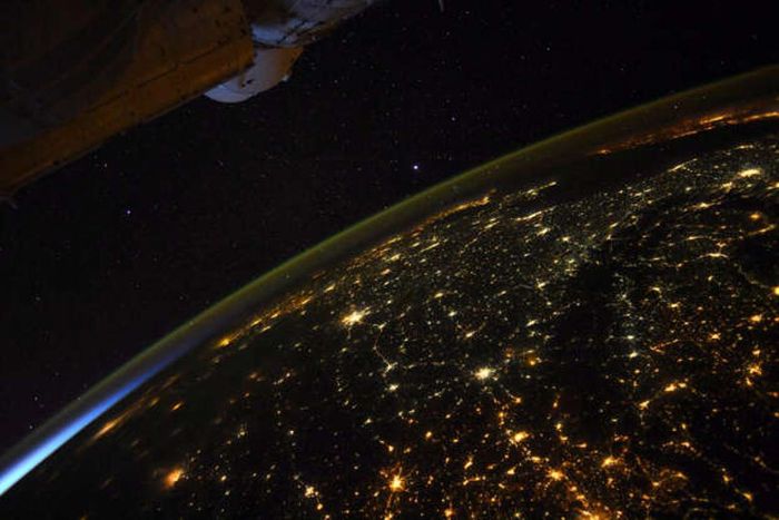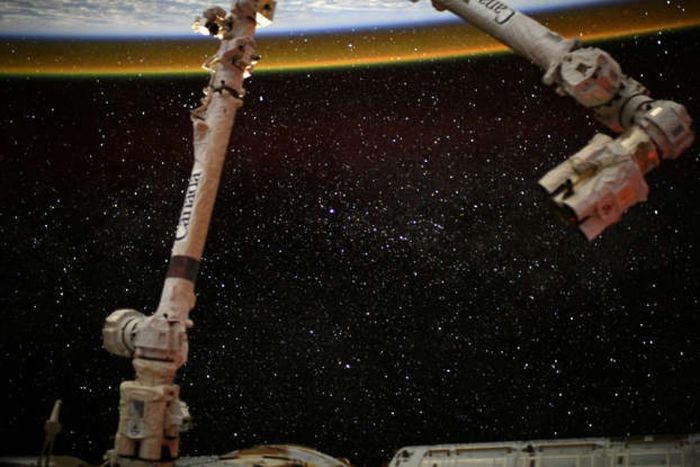 Một hình ảnh được phơi sáng trong thời gian dài cho thấy những vì sao lấp lánh, cánh tay robot tự động Canadarm của trạm vũ trụ và quầng sáng phía trên Trái Đất.