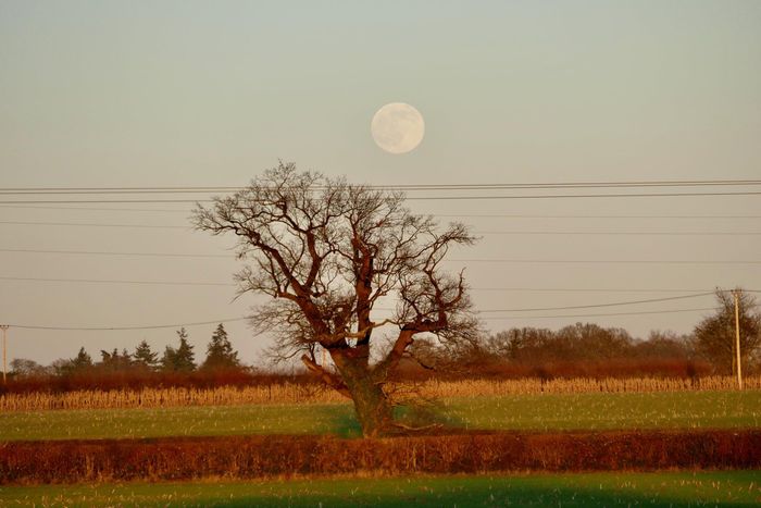 Mặt Trăng xuất hiện trên bầu trời màu hồng sẫm đầy thơ mộng khi hoàng hôn dần buông xuống tại vùng nông thôn ở Dunsden, Oxfordshire, Anh. Ảnh: Geoffrey Swaine / Rex / Shutterstock.