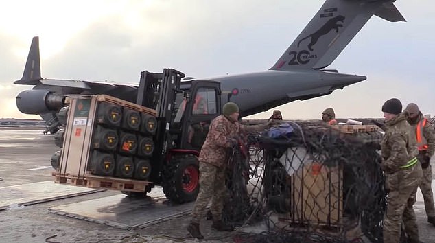 Video do truyền thông Anh đăng tải cho thấy các vũ khí được xe chuyên dụng đưa ra khỏi máy bay vận tải tại một sân bay Ukraine.