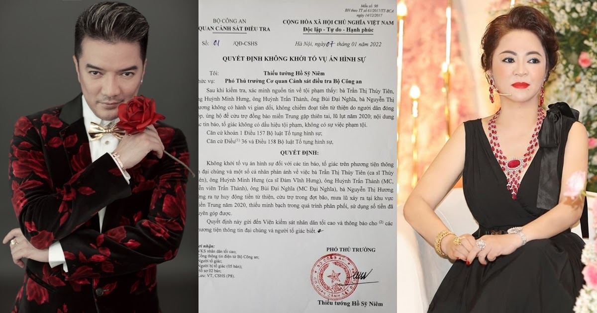 Ngày 23/1, Đàm Vĩnh Hưng vui mừng thông báo kết quả “Giải quyết nguồn tin về tội phạm” từ Bộ Công An. Trong thông báo ghi rơ, căn cứ vào tài liệu, chứng cứ đă xác minh. Cơ quan cảnh sát điều tra, Bộ Công an (CSHS) xác định ca sĩ Thủy Tiên, Trấn Thành, Đàm Vĩnh Hưng, Đại Nghĩa và mẹ ruột Hồ Ngọc Hà không có hành vi gian dối, không chiếm đoạt tiền từ thiện người dân quyên góp ủng hộ đợt lũ miền Trung 2020. Do đó, quyết định không khởi tố vụ án h́nh sự.