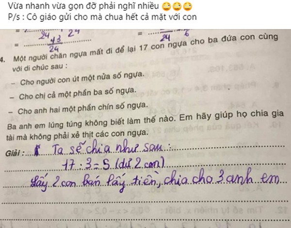 Cụ thể bé gái đã đưa ra lời giải vô cùng hợp tình hợp lý là chia đều cho 3 anh em: 'Ta sẽ chia: 17: 3 = 5 (dư 2 con). Lấy 2 con bán lấy tiền, chia cho 3 anh em'.