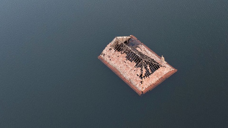 Mái của một ngôi nhà nổi giữa lòng hồ chứa (Ảnh: Reuters).