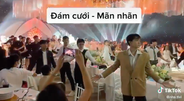Theo đó, trong lúc quan khách đang tận hưởng bữa tiệc cưới, dàn khách trẻ ngồi dãy giữa bỗng đứng lên nhảy khiến cả hội trường sững sờ. Tiếng nhạc vang lên cũng là lúc họ đứng dậy và nhảy theo nhịp rất đồng đều. Màn trình diễn mãn nhãn của nhóm bạn trẻ nhận được sự hưởng ứng và cổ vũ của những quan khách tham gia tiệc cưới.
