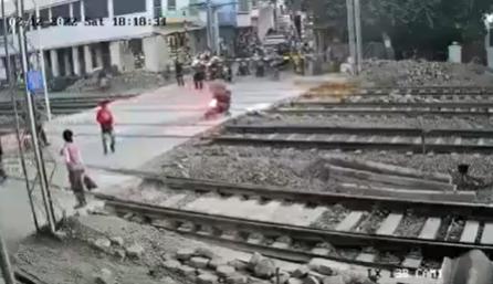 Tuy nhiên, người đàn ông lái xe máy vẫn cố băng qua. Khi di chuyển đến đường ray thì bỗng mất lái, ngã nhào xuống đất. Đúng lúc này, tàu hoả lao tới.