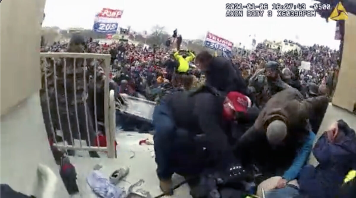 Anh Justin Winchell (trong chiếc áo khoác màu xanh lam ở bên phải) phản ứng khi một sĩ quan Sở Cảnh sát Thủ đô tấn công người bạn đang bất tỉnh của anh, cô Rosanne Boyland. (Ảnh: Camera an ninh gắn trên người cảnh sát/Bộ Tư pháp Hoa Kỳ)