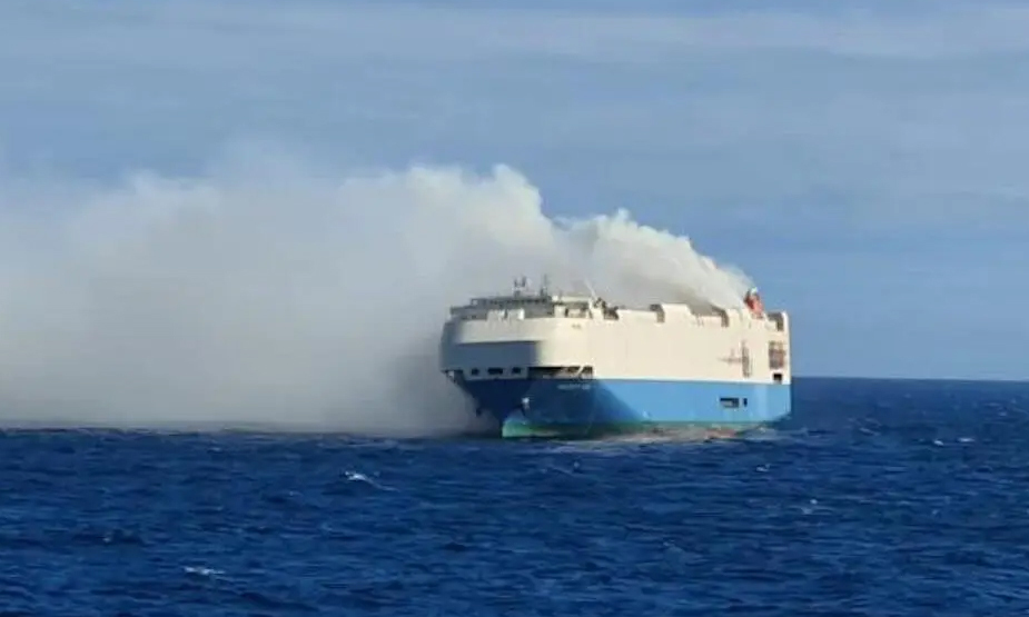 21oilKhói trắng mù mịt bốc lên từ tàu Felicity Ace chở hàng nghìn ôtô. Ảnh: Marinha Portuguesa