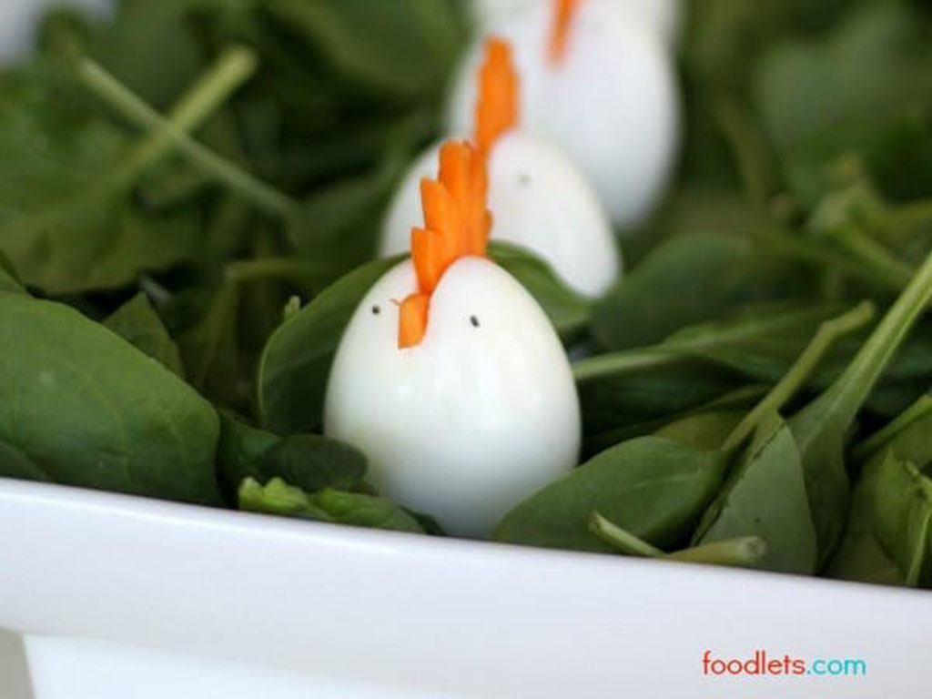 Bạn có thể lấy 2 hạt mè đen gắn thành 2 con mắt. Cuối cùng, đặt những quả trứng lên rau xanh cho bắt mắt. Những đứa trẻ rất thích tạo hình quả trứng như thế này, rất đơn giản và dễ làm.