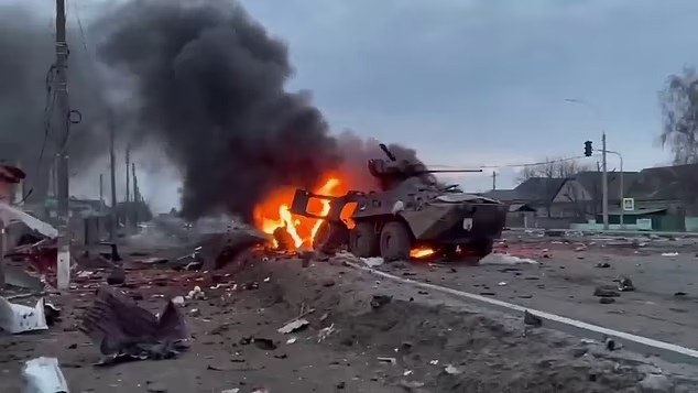 Các lực lượng Nga được cho là tiếp tục chịu tổn thất trên chiến trường Ukraine (trong ảnh là một phương tiện bị phá hủy hôm 10/3) sau khi không lường trước được mức độ kháng cự của quân đội Ukraine. Ảnh Daily Mail
