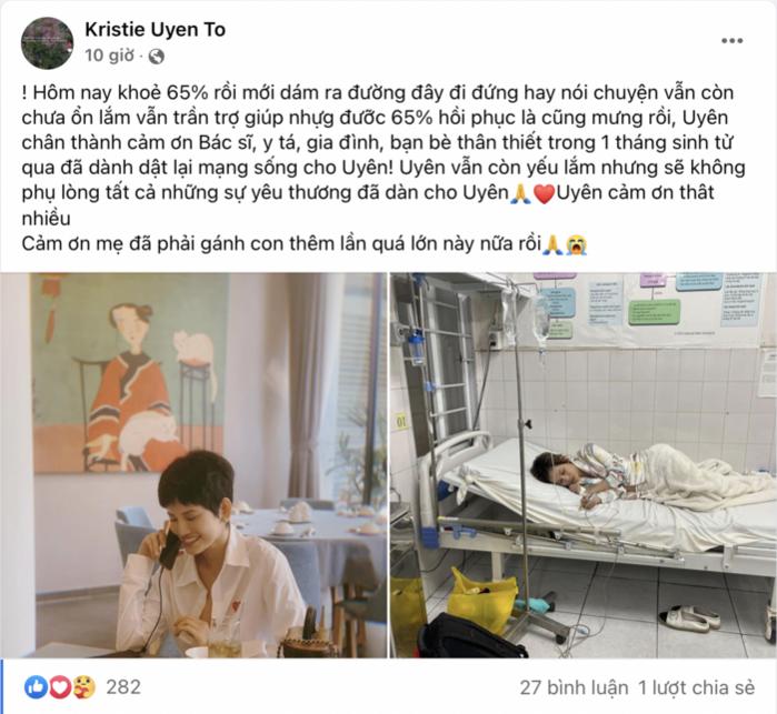"Hôm nay khoẻ 65% rồi mới dám ra đường đây đi đứng hay nói chuyện vẫn còn chưa ổn lắm, vẫn cần trợ giúp nhưng được 65% hồi phục là cũng mừng rồi. Uyên chân thành cảm ơn bác sĩ, y tá, gia đình, bạn bè thân thiết trong một tháng sinh tử qua đã giành giật lại mạng sống cho Uyên!