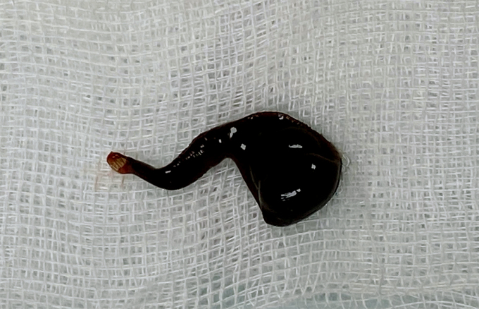Con đỉa được gắp ra khỏi mũi bệnh nhân. Ảnh: Cẩm Mai
