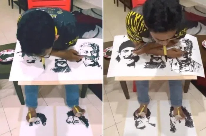 Mohd Saiful Baharom Shah, một giáo viên trung học 39 tuổi, là bố của 6 đứa trẻ đến từ Malaysia đã trình diễn tài năng độc nhất vô nhị của mình khiến ai nấy không khỏi kinh ngạc. Người đàn ông này có thể cùng một lúc vẽ 5 bức chân dung khác nhau, sử dụng hai tay, hai chân và miệng.