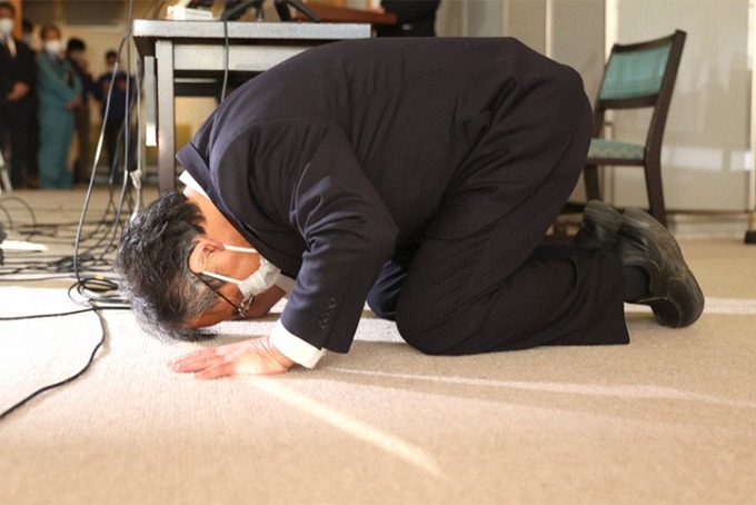 Ông Seiichi Katsurada, chủ tịch Shiretoko Yuransen, quỳ xuống và xin lỗi trong cuộc họp báo ở thị trấn Shari, Hokkaido, ngày 27/4. Ảnh: Mainichi