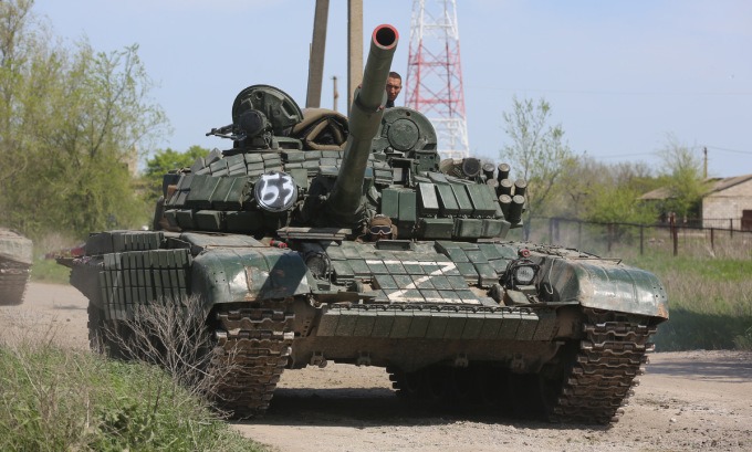 Xe tăng phe ly khai thân Nga di chuyển tại thành phố Mariupol, miền nam Ukraine, hôm 7/5. Ảnh: AFP.