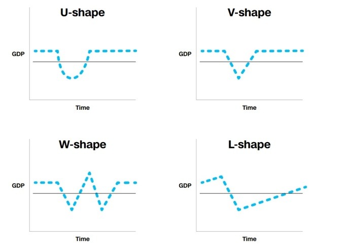 Các nhà kinh tế học cho rằng Đại suy thoái thập niên 30 và Khủng hoảng tài chính 2008 đều theo hình chữ L. Mỹ đã mất 6 năm mới quay lại mốc GDP của năm 2007.